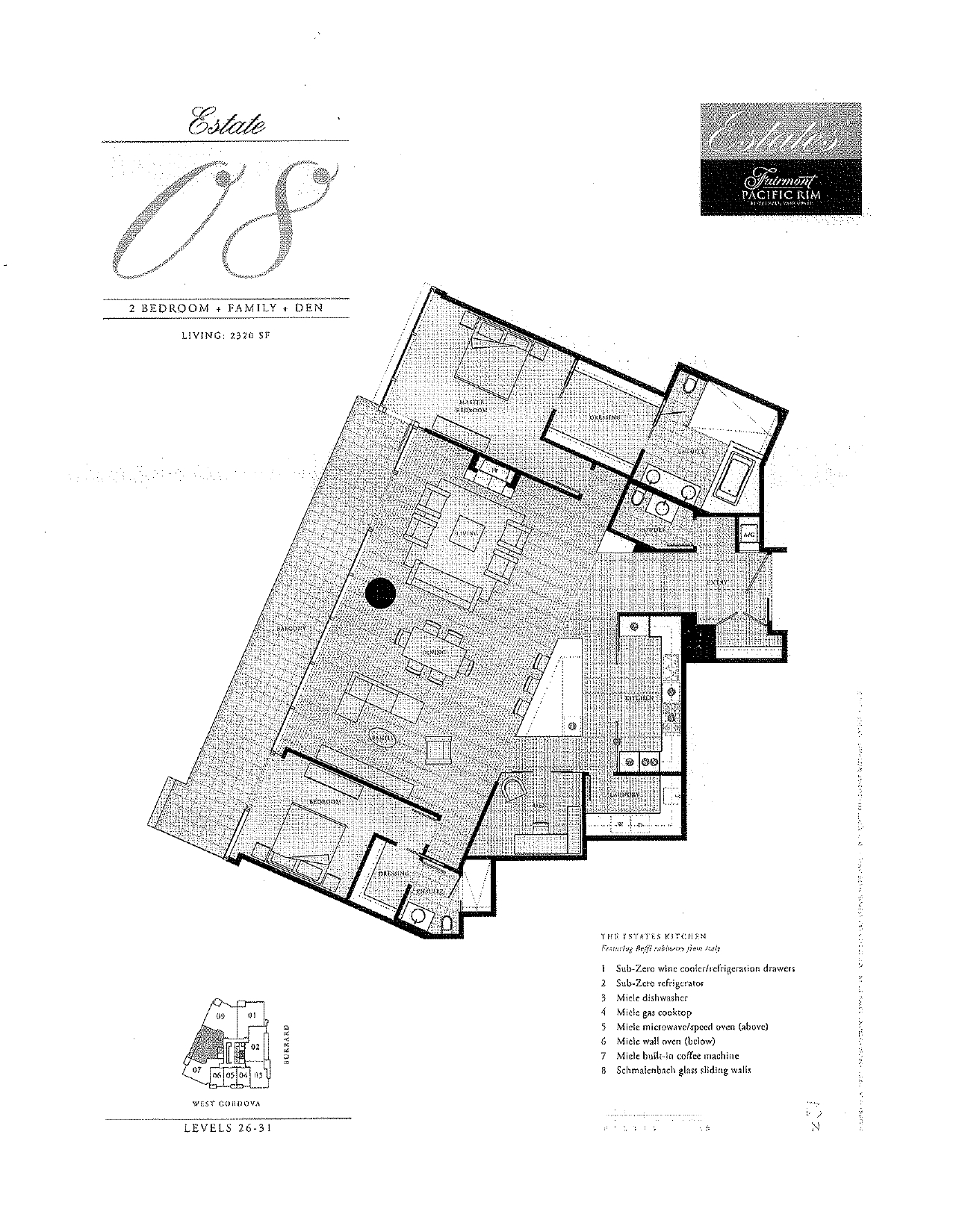 The Fairmont Pacific Rim Estates is a collection of ultra-modern luxury residences. This stunning, north-west facing 2 bedroom plus den, 3 bathroom suite offers 2,300 sq.ft. of World Class living with breathtaking views of the ocean, Coal Harbour, Stanley Park and the North Shore mountains. Exquisite in finishings, this beautiful suite features a custom gourmet hideaway kitchen with large island and breakfast bar, WENGE cabinetry, MIELE appliances and exquisite BOFFI cabinets. Luxurious features include large living and dining rooms, a private den, air-conditioning, frosted glass doors, spa-like ensuited bathrooms, a massive 50’ sunfilled terrace, LUTRON electronic shades, gas fireplaces and unique touches such as leather-bound entry ways, I-pod docking systems, rich hardwood flooring and over-height ceilings. Located at the exquisite 5-star Fairmont Hotel with services only a phone call away: Concierge, World-Class Spa, Valet, Housekeeping, Room Service and a State-of-the-Art Recreation Centre. Two parking stalls included. NO GST!