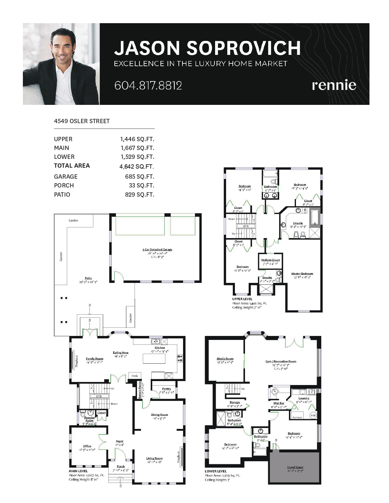 Exquisitely maintained, the main level features beautiful hardwood flooring, magnificent crown moldings and baseboard detail, an elegant foyer entry, spacious living and dining areas designed for entertaining on a formal scale, elegant fireplace and mullioned paned windows, a sensational custom kitchen with top-of-the-line Wolf & Subzero appliances and large centre island for entertaining, breakfast bar, separate dry pantry, an adjacent eating area & spacious family room with cozy fireplace, as well as, a private office, all opening out to sun-filled grounds & lush gardens surrounding a family’s paradise complete with miles of patio space, large outdoor lounge and dining area for summer entertaining, as well as, access to the separate 3 car garage off the lane.